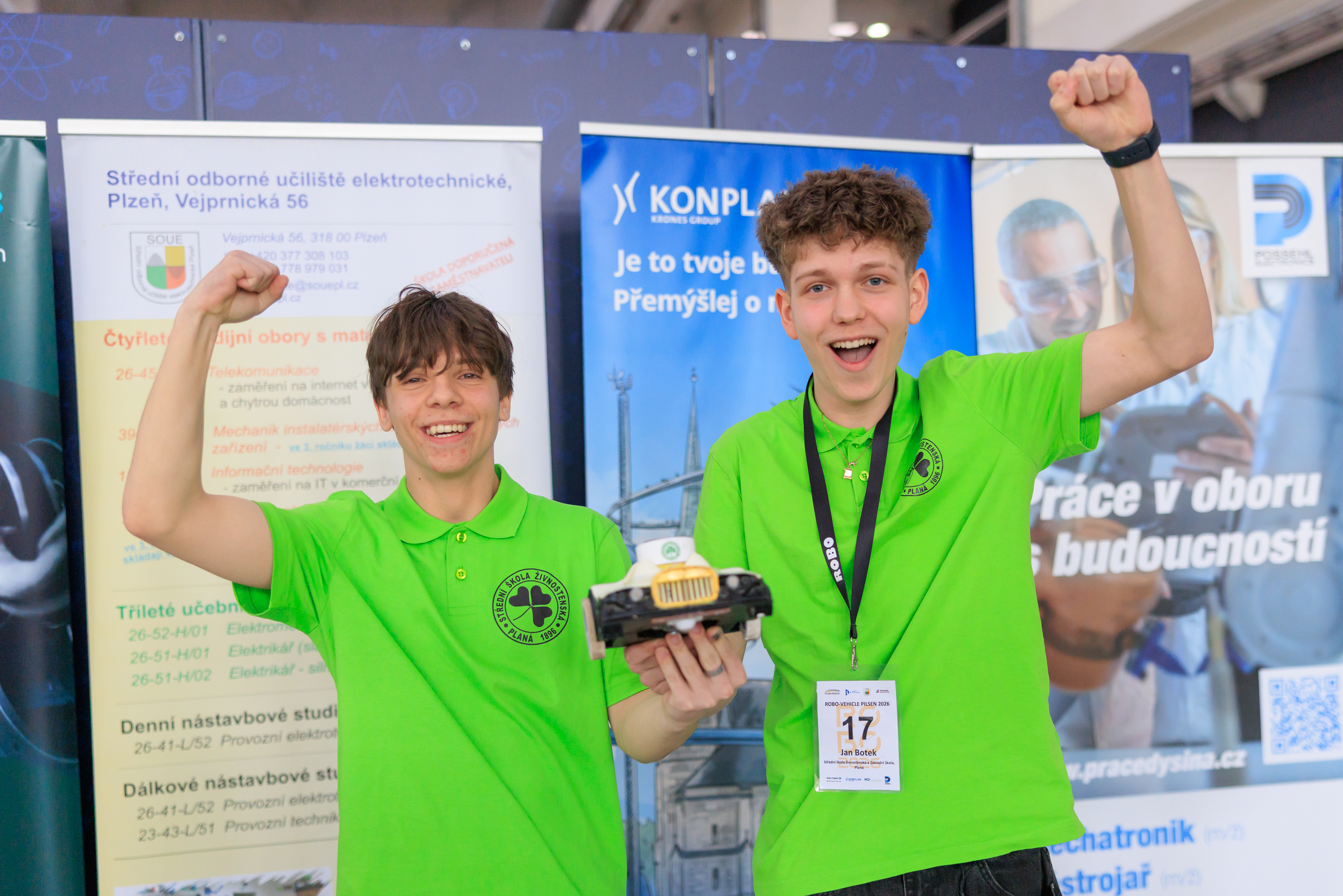 „Nechce se mi věřit, že jsme to dali, až z toho sotva dýchám,“ popisuje první pocity Jan Botek z týmu SŠŽ a ZŠ Planá těsně po dramatickém finále kategorie Nejlepší jízda, kdy s Robinem Hradem porazili turecký tým. „Jeli jsme na soutěž s cílem uspět, ale vyhrát kategorii, to jsme nečekali,“ dodává. Robotické vozítko, s nímž plánští studenti prvního ročníku oboru Spojový mechanik pro IT ovládli kategorii, sestavovali zhruba 3 měsíce. „Nejtěžší bylo vymyslet tu stabilizační část vozítka, kvůli které jsme museli hodně věcí měnit, šlo hlavně o šasi. To nám dokonce před finále celé prasklo a museli jsme ho celé měnit,“ popisuje Robin Hrad. „Design vozítka jsme si navrhli celý sami, ale samozřejmě s tiskem nám pomáhali mistři,“ doplňuje. Celý projekt probíhal pod dozorem pedagogů. „Vše jsme si sami navrhli a sestavili, když bylo třeba, učitelé nám spíš poradili, abychom si tu cestu našli sami,“ dodává Jan Botek.