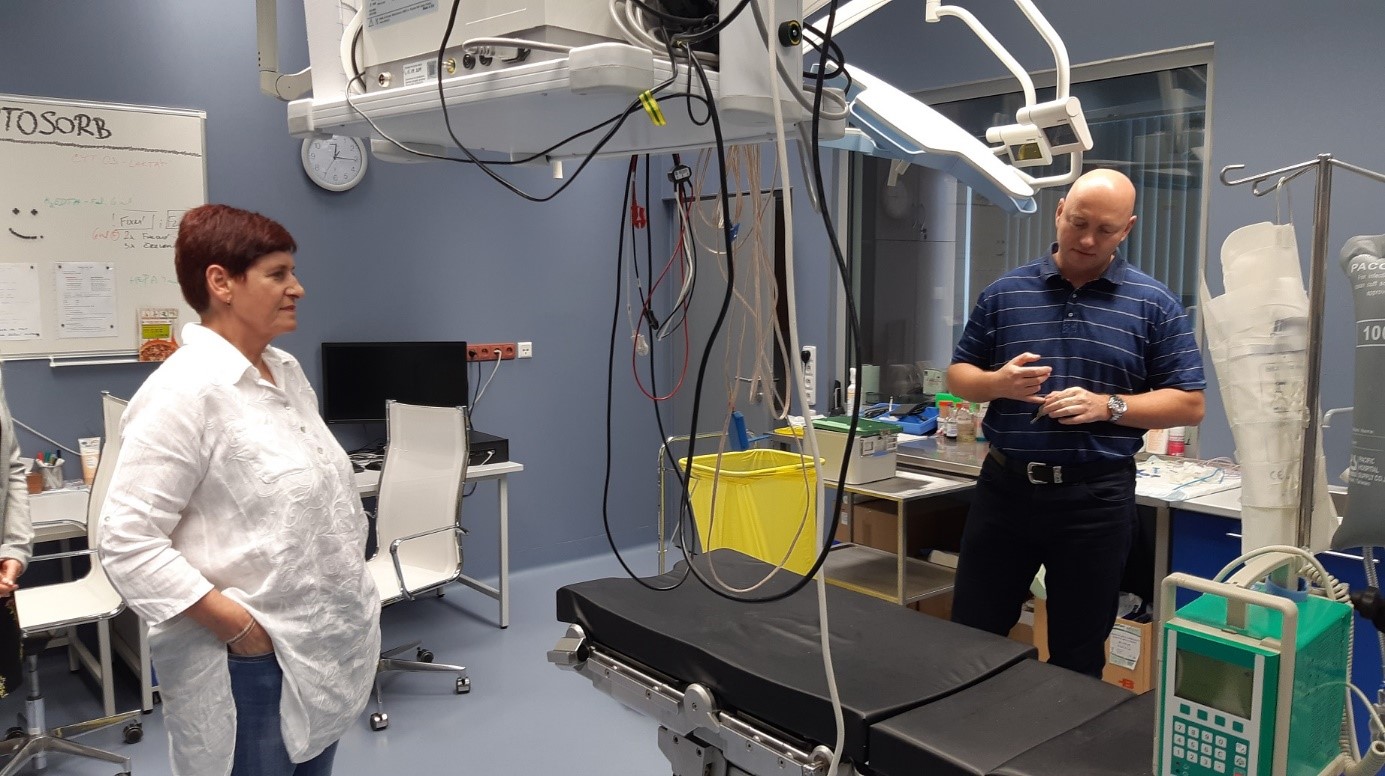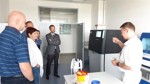 Vědecký ředitel Biomedicínského centra Milan Štengl představuje náměstkyni hejtmana Marcele Krejsové experimentální vybavení Biomedicínského centra.