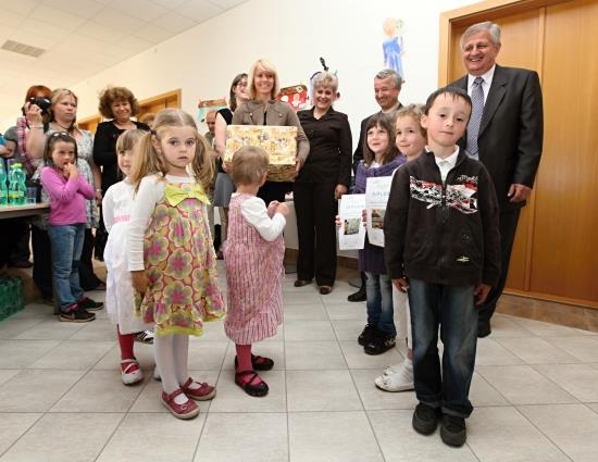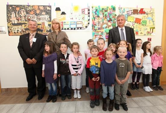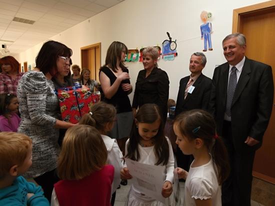 vítězným mateřským školám gratulovali zprava: J.Bauer (1. náměstek hejtmana PK), V.Kostelný (ředitel Krajského centra osobní dopravy ČD v Plzni) a Z.Kmochová (ředitelka a jednatelka spol. POVED)