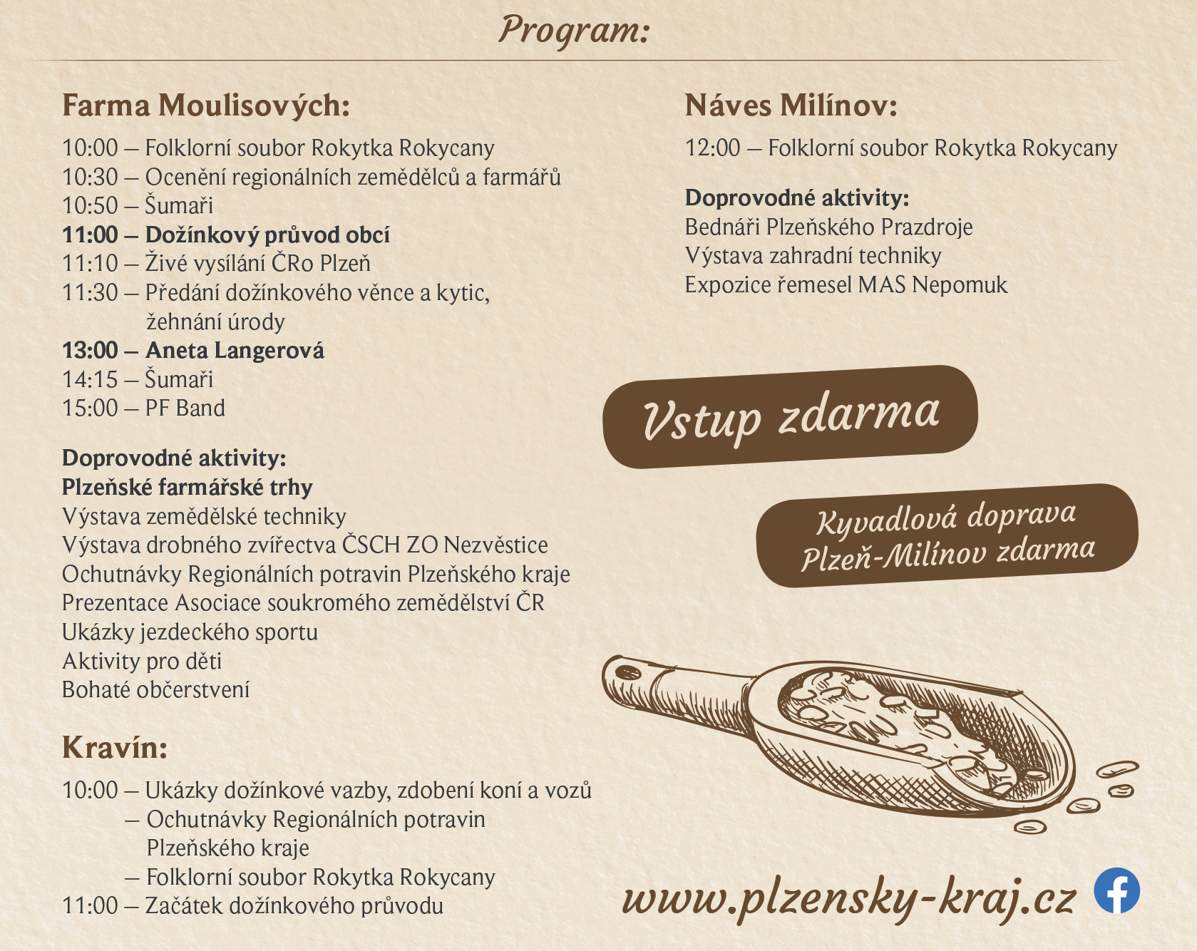 Ani tentokrát nebudou chybět ochutnávky oceněných Regionálních potravin Plzeňského kraje, ukázky dožínkových tradic a zvyklostí v podání Folklórního souboru Rokytka Rokycany a mnoho dalších doprovodných aktivit v rámci celého dne. V Milínově se seznámíte s tradičními českými řemesly a uvidíte ukázku práce Bednářů Plzeňského Prazdroje. Navštívit můžete výstavu zemědělské a zahradní techniky, která ke sklizni neodmyslitelně patří, ale i na výstavu drobného zvířectva ČSCH ZO Nezvěstice.