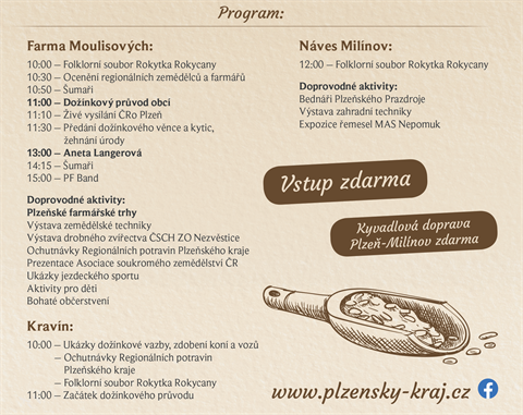 Tradiční oslavy ukončení sklizně a poděkování za úrodu pořádá Plzeňský kraj již po deváté, tentokrát v sobotu 7. září 2019 od 10:00 hodin na Farmě Moulisových v Milínově na jižním Plzeňsku.