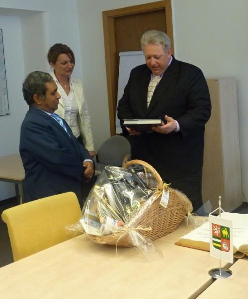 hejtman M.Chovanec obdržel od velvyslance knihu o Indii. V.Ashok dostal od hejtmana koš s regionálními potravinami