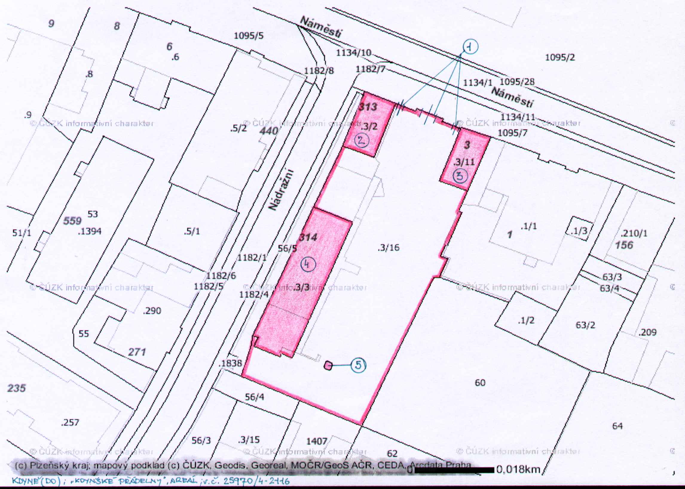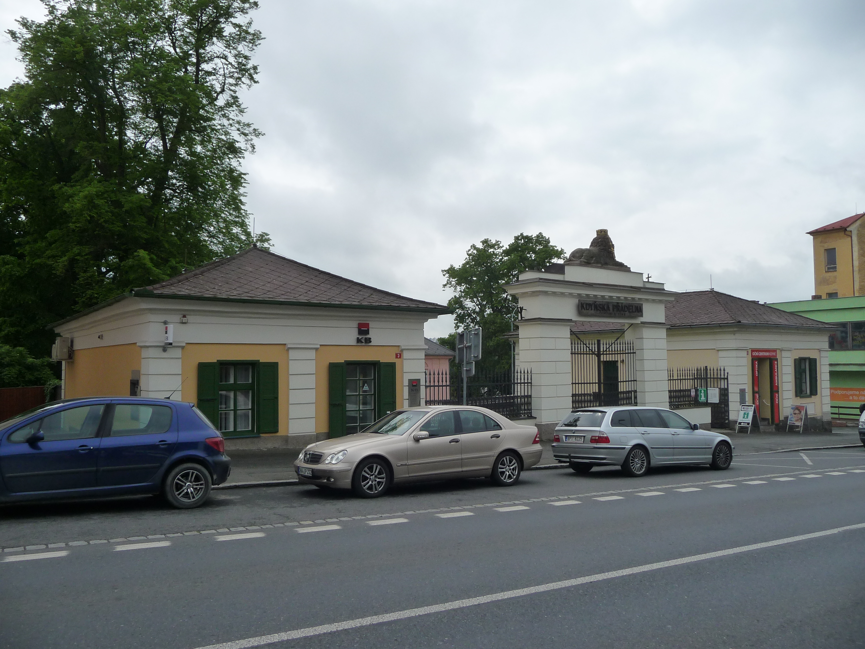 1) brána s brankami a plastikou lva 2) strážní domek čp. 313 3) strážní domek čp. 3 4) obytný dům čp. 314 5) kašna