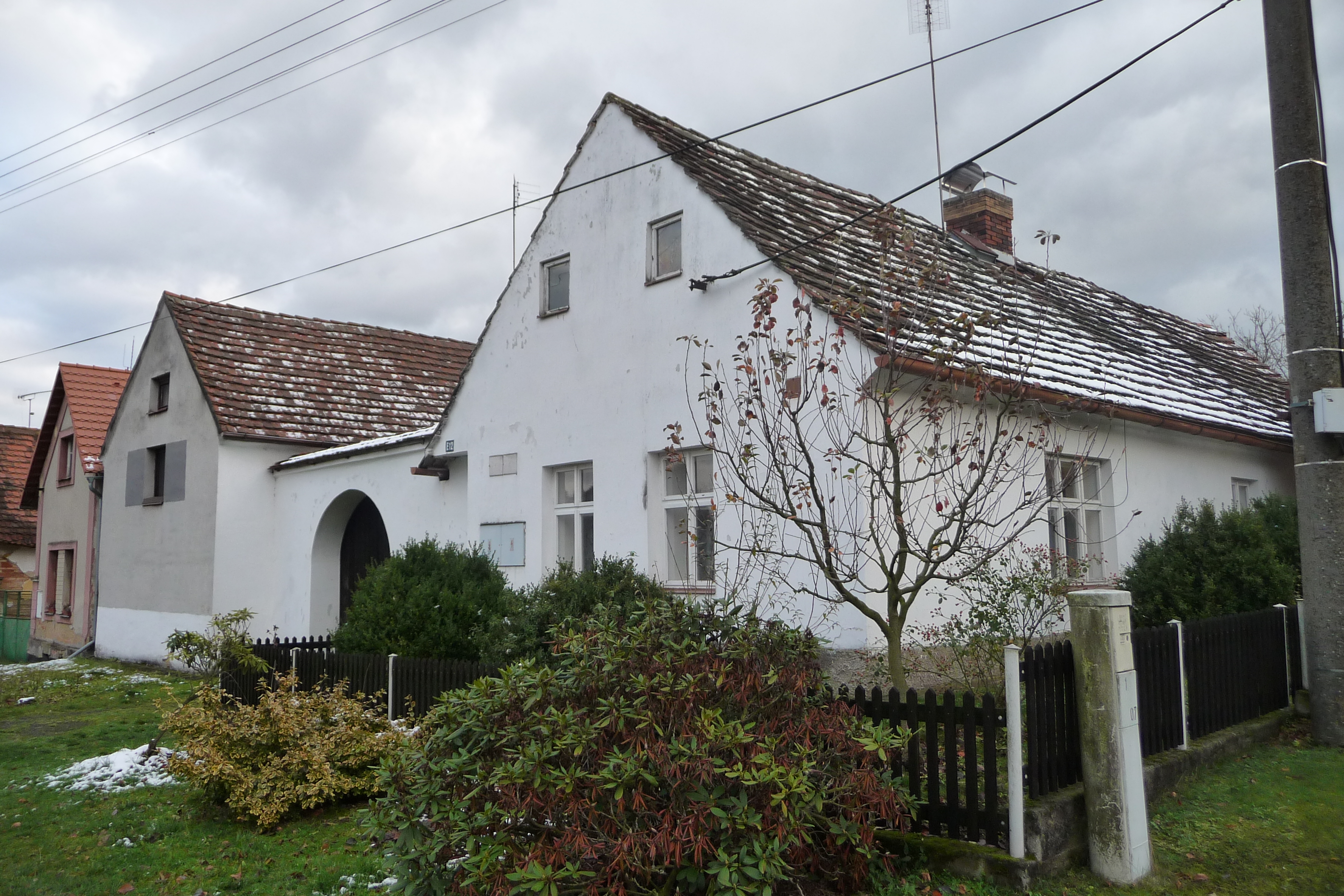 Zděný, přízemní statek s branou a brankou, půlkruhově a segmentově zaklenutý s pultovou stříškou s bobrovkami. Po pravé straně brány přiléhá obytné stavení dvouosé s dvěma půlkruhovými okénky ve štítě, se sedlovou střechou bobrovou. Stavení lehce předstupuje před úroveň brány, stejně jako patrová sýpka vlevo s novodobou přístavbou vážnice. Ve štítě sýpky dvě okna, sedlová střecha kryta bobrovkami. Stavení má zvýšené zápraží. Sýpka s dvěma vchody s kosočtverečně skládanými dveřmi měla dříve dvě komory. Nyní spojeny v jednu. Vyhořela r. 1942. Klasicistní barokní vjezd, zděné obytné stavení a roubená stodola.