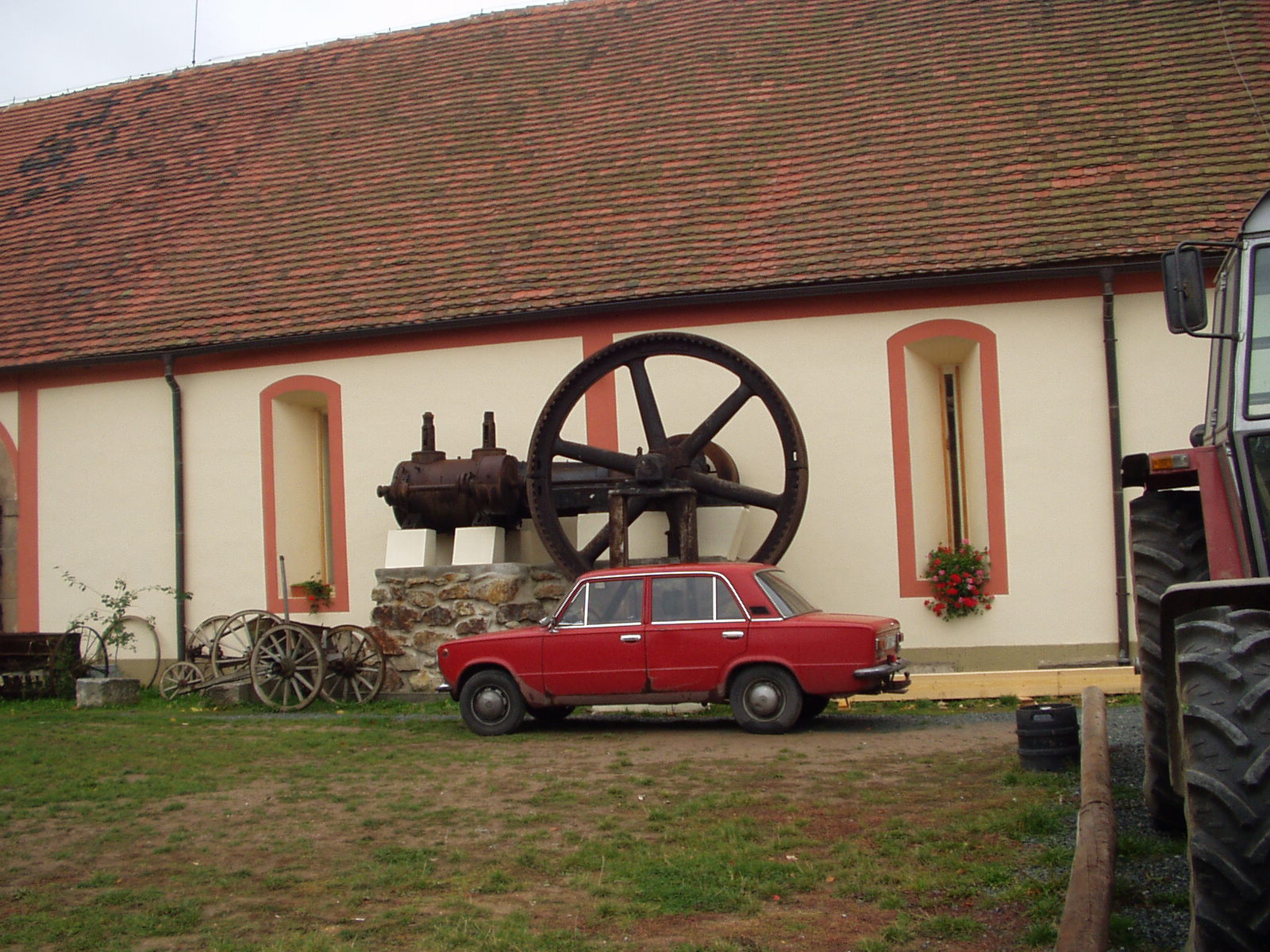 ležatý jednoválcový parní stroj s Kentzovým rozvodem, vyroben firmou Škoda
