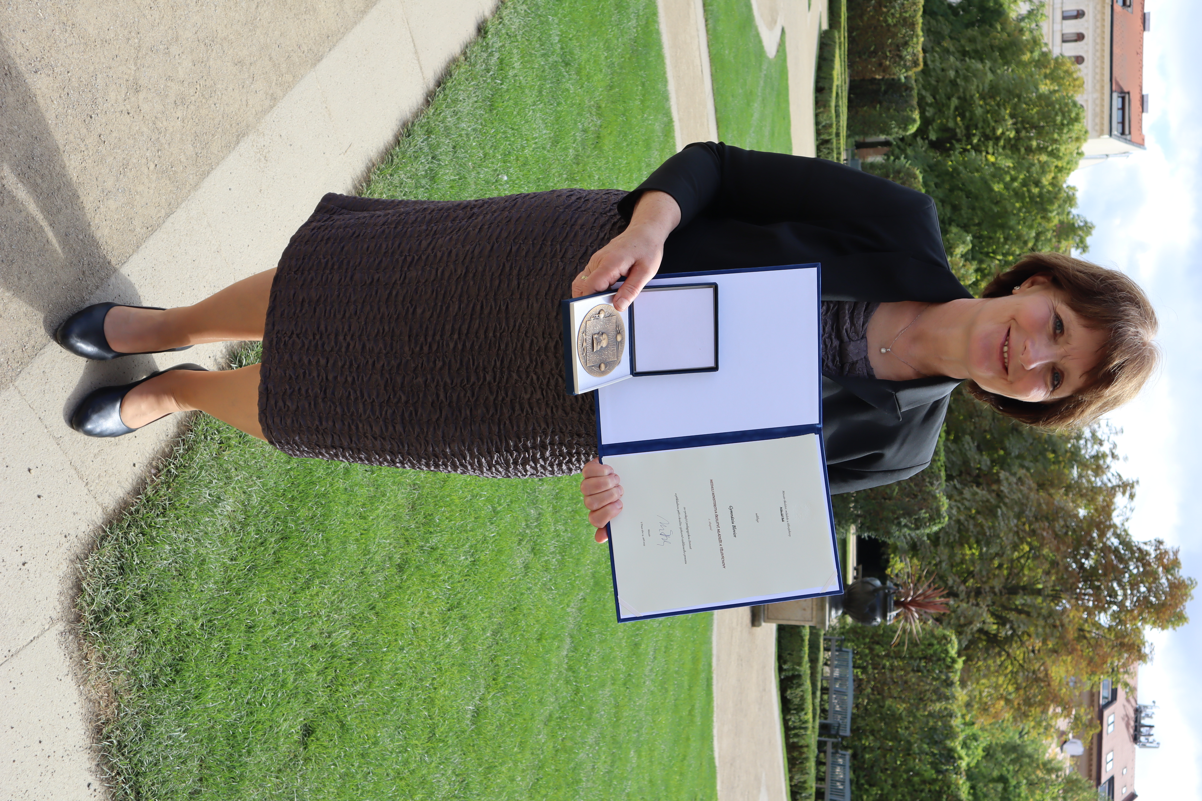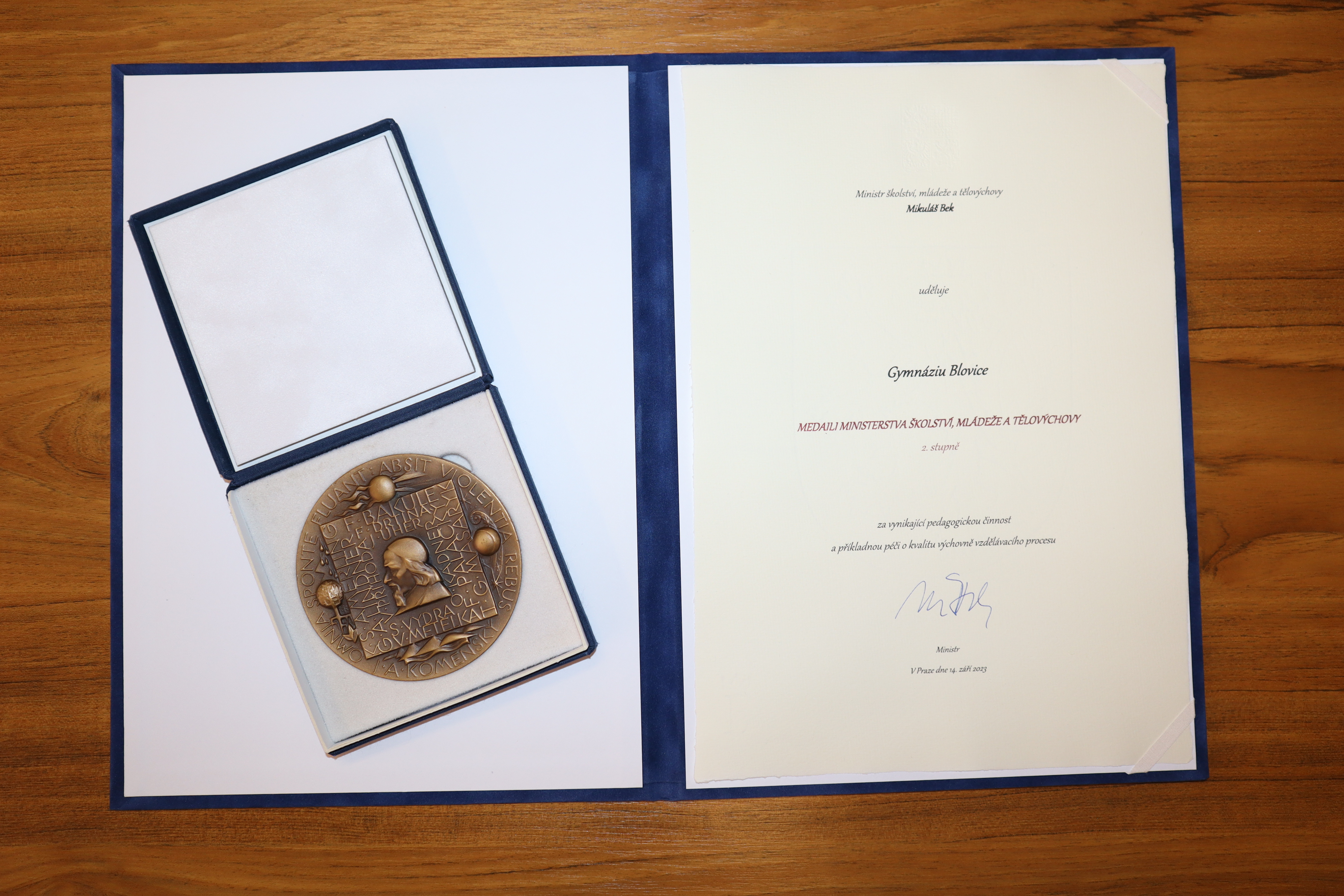 Gymnázium Blovice do nového školního roku vykročilo mimořádným úspěchem. Ředitelka gymnázia Marcela Šustrová ve čtvrtek 14. 9. 2023 převzala z rukou ministra školství Mikuláše Beka bronzovou medaili MŠMT, která byla udělena malému regionálnímu gymnáziu za vynikající pedagogickou činnost a příkladnou péči o kvalitu výchovně vzdělávacího procesu. Slavnostního předávání medailí, které proběhlo v zahradách Valdštejnského paláce, se kromě ředitelky školy zúčastnily i JUDr. Jaroslava Havlíčkova MBA, vedoucí odboru školství, mládeže a sportu Plzeňského kraje, a zástupkyně ředitelky Lada Kotlanová.