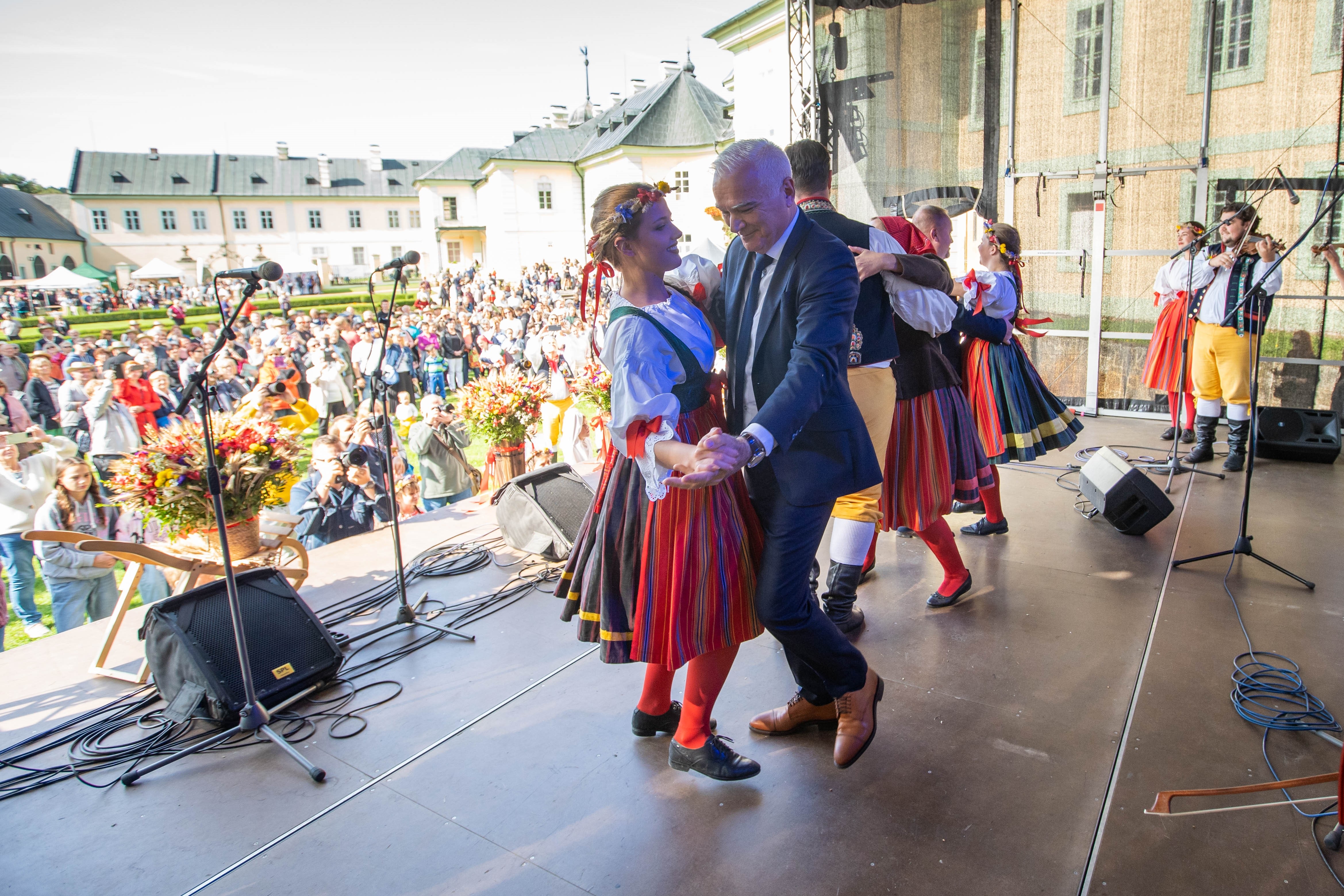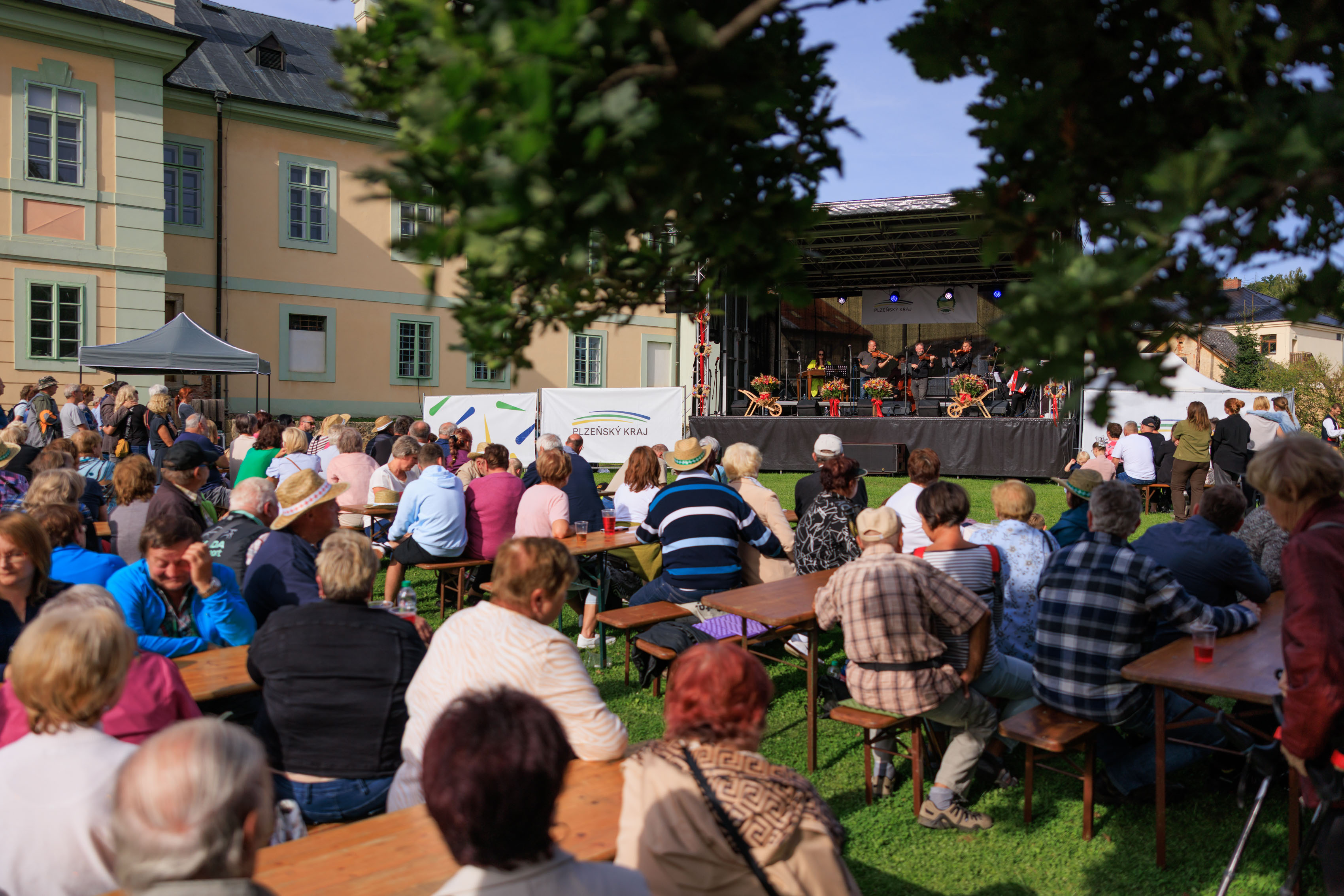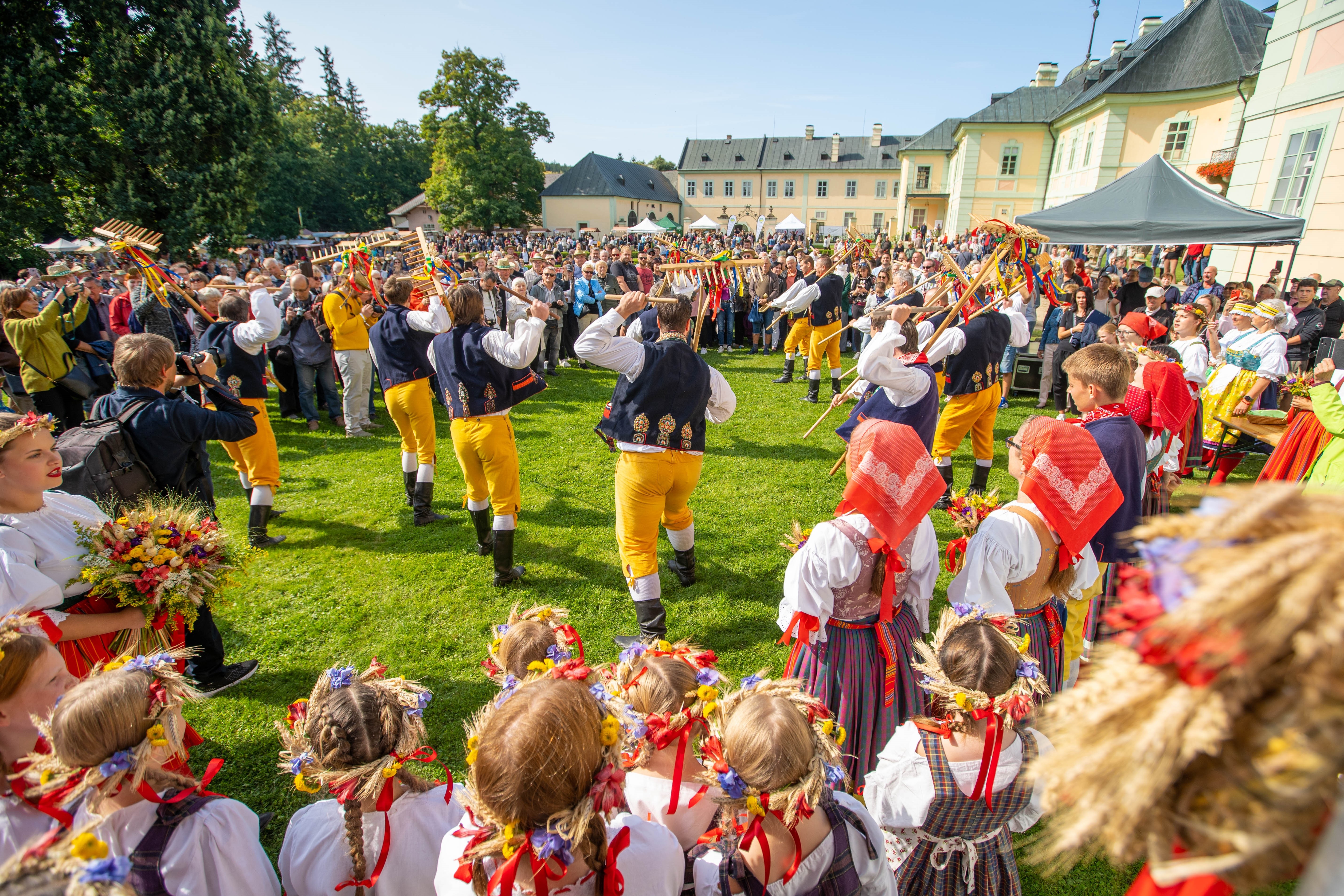 Součástí programu byla také tradiční dožínková veselice – zámeckým parkem prošel průvod za doprovodu folklórního souboru, hejtman převzal dožínkový věnec a poté symbolicky pozval chasu na pivo.
