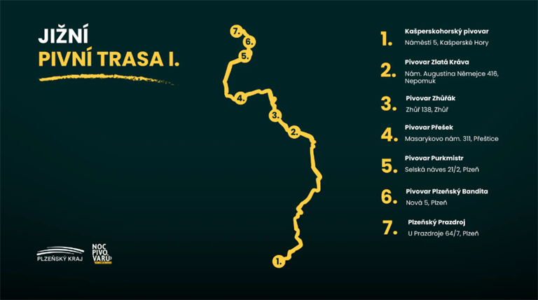 Autobus Jižní trasy I. startuje v Kašperskohorském pivovaru v pátek 24. dubna v 16 hodin a postupně navštíví pivovary Zlatá Kráva v Nepomuku, Zhůřák v Chocenicích, Přešek v Přešticích, Purkmistr v Plzni-Černicích, Plzeňský bandita v Plzni-Koterově, aby zakončil svoji trasu před branou Plzeňského Prazdroje s pivovary Pilsner Urquell, Gambrinus a Elektrárna. Autobus po cestě čeká v každé ze zastávek přibližně 10 minut, na konečné v Plzni pak přes dvě hodiny, než se ve 21:40 vydá zpět do Kašperských hor. Jízdní řád ke stažení zde.