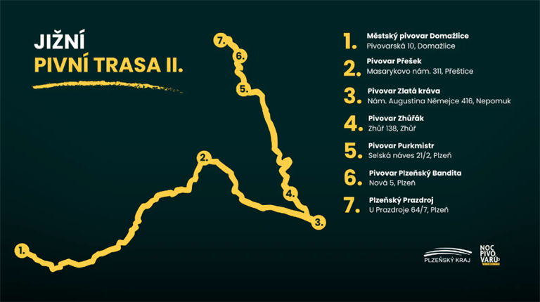 Autobus Jižní trasy II. začíná jízdu v pátek 24. dubna v 16:00 u Městského pivovaru Domažlice a postupně objede pivovary Přešek v Přešticích, Zlatá Kráva v Nepomuku, Zhůřák v Chocenicích, Purkmistr v Plzni-Černicích, Plzeňský bandita v Plzni-Koterově. Konečnou zastávkou je Plzeňský Prazdroj s pivovary Pilsner Urquell, Gambrinus a Elektrárna, kam dorazí přibližně v 19:15. Autobus po cestě čeká v každé ze zastávek přibližně 10 minut, na konečné v Plzni pak hodinu, než se ve 20:15 vydá zpět do Domažlic. Jízdní řád ke stažení zde.