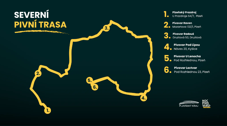 Dva autobusy Severní trasy vyjedou v pátek 24. dubna v hodinovém intervalu v 16 a 17 hodin od brány Plzeňského Prazdroje z centra Plzně, kam se také vrátí přibližně ve 20:10 a 21:10. Postupně zamíří do pivovaru Raven, dále staví v Druztové v pivovaru Radouš, následují Kyšice s Pivovarem pod Lípou a dva blízcí sousedi v plzeňském Újezdě – pivovar U Lenocha a pivovar Lectvar. V každé ze zastávek čekají přibližně 15 minut, na konečné pak zhruba hodinu a poté se vracejí po stejné trase zpět do centra Plzně. Jízdní řád ke stažení zde.