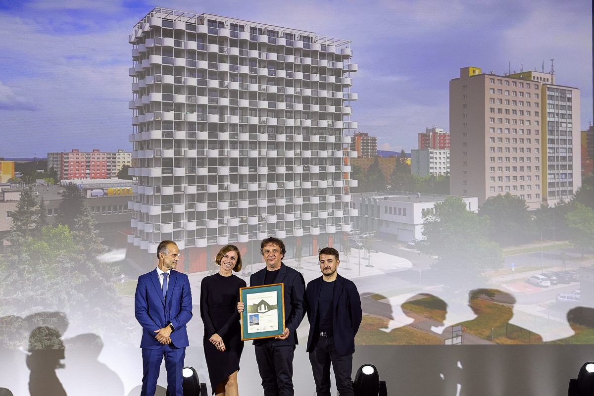 Čestné uznání poroty je uděleno za kultivované a nápadité ztvárnění rezidenční architektury, která se prezentuje neotřelými výrazovými prostředky a současně nezapomíná na poloveřejný prostor podporující komunitní život i soukromí obyvatel.
